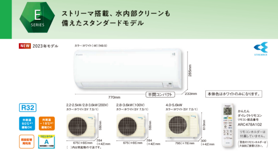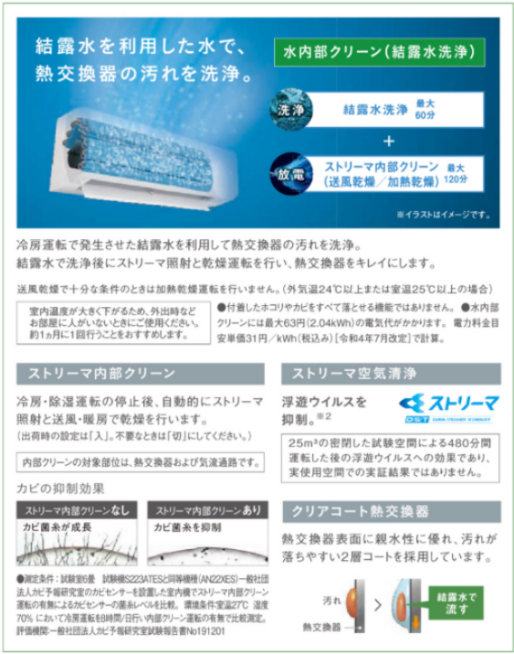 「ストリーマ」、「水内部クリーン」を備えたベーシックモデルのエアコン、Eシリーズの2022年モデル(おもに6畳用)。結露水を利用し熱交換器を洗浄。
