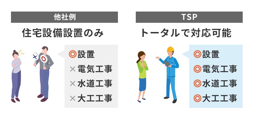 TSPでは、キッチンや水回りのリフォームなど、電気工事や水道工事、大工工事が必要な施工にも対応できる職人が揃っています。商品の販売から施工まで、すべてお任せいただけるため、中間マージンを省いたリーズナブルな価格とスピーディな施工を実現しています。