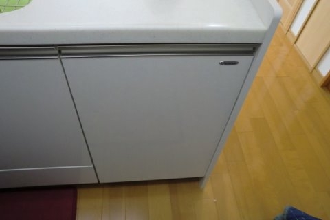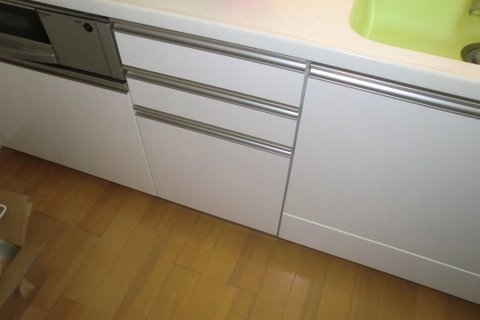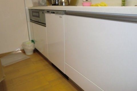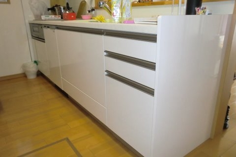 ヤマハ社製キッチンで45センチキャビネットからの食洗器導入施工です。引き出し収納はキッチン右側へ移設しました。