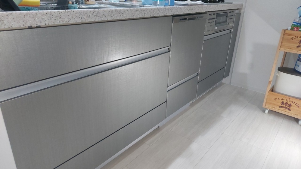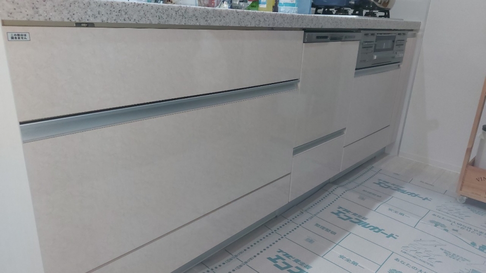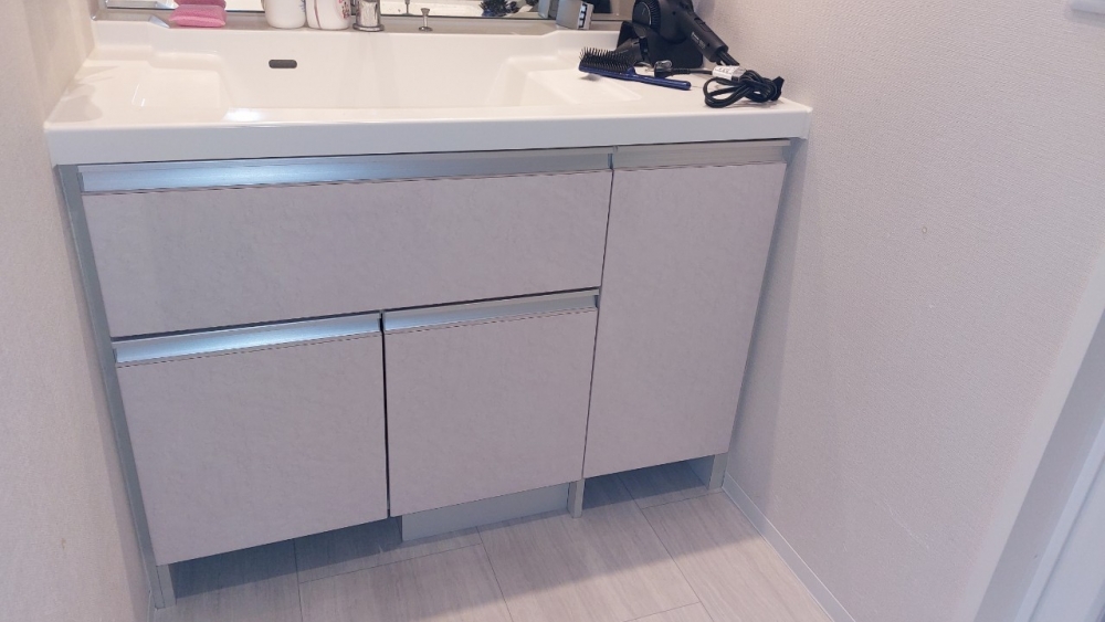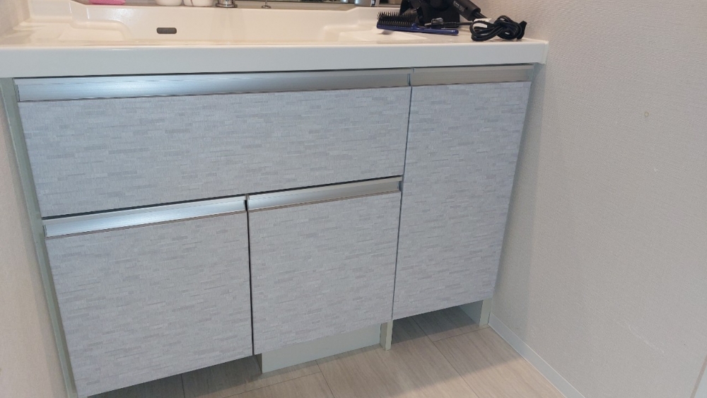 システムキッチン並びに洗面台の化粧面材部分をカラーシートを使用して色変更をいたしました。