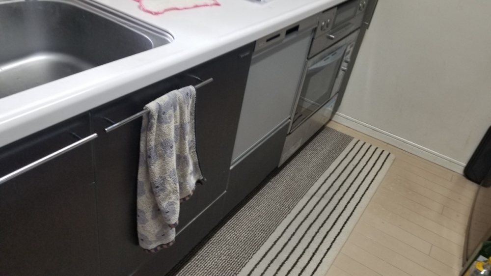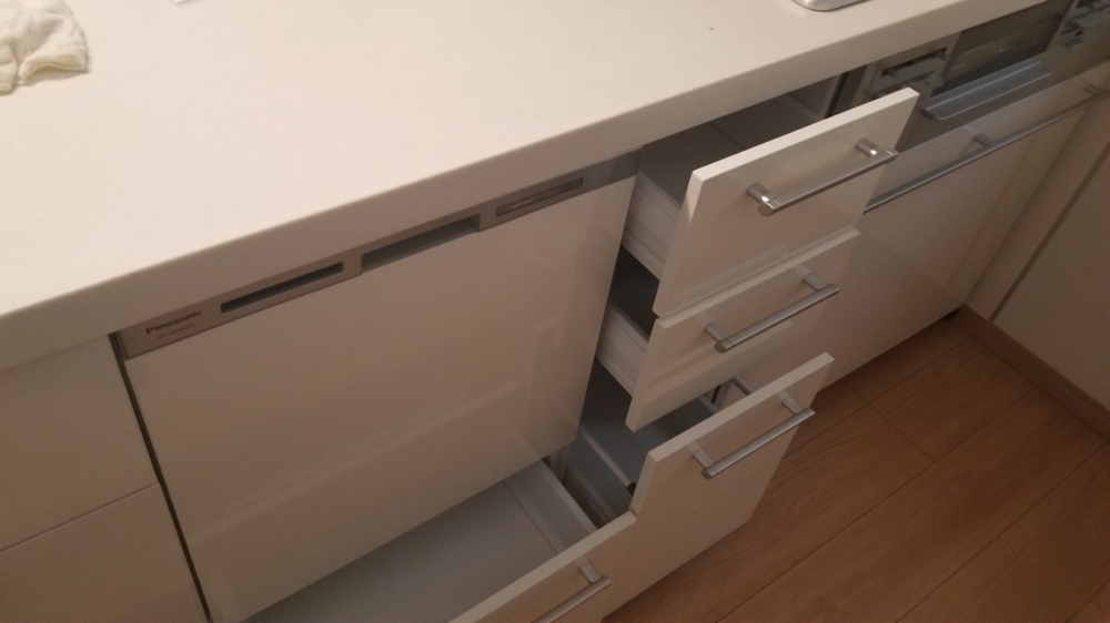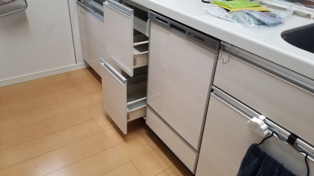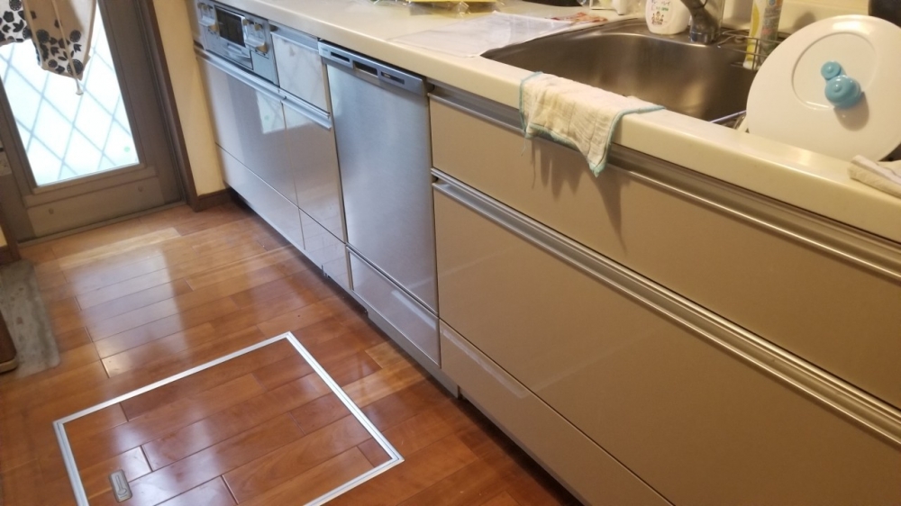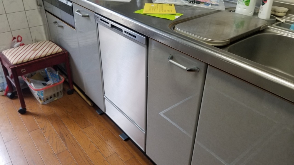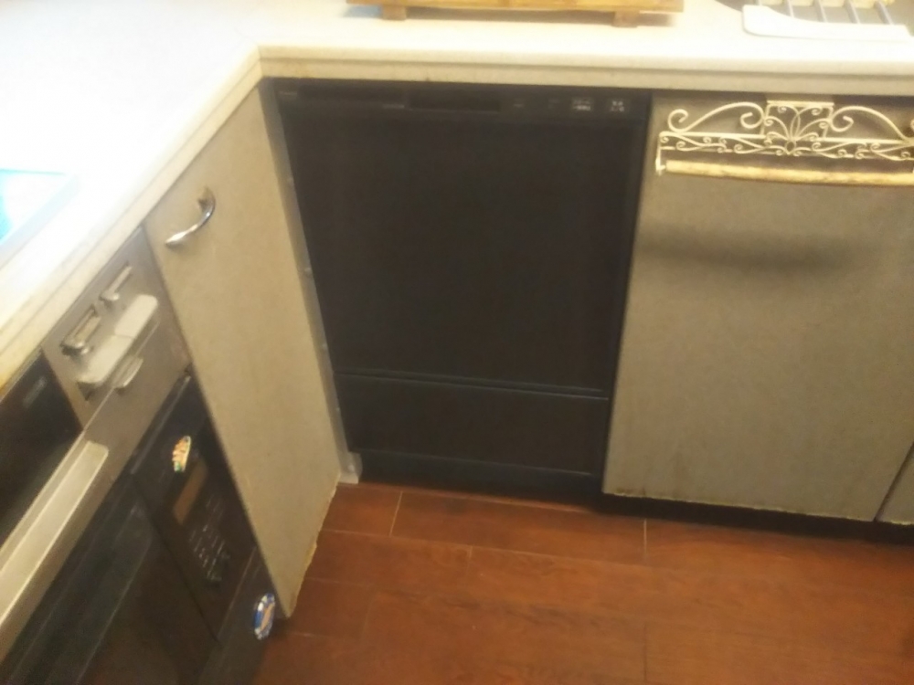 現地調査で拝見しましたところファーストプラス製キッチンにミドルタイプ食洗機用キャビネットがすでに用意されておりましたが、お客様のご要望がディープタイプ食洗機でしたので、キャビネット本体は取り外しパナソニックNP-45MD8Sを設置いたしました。