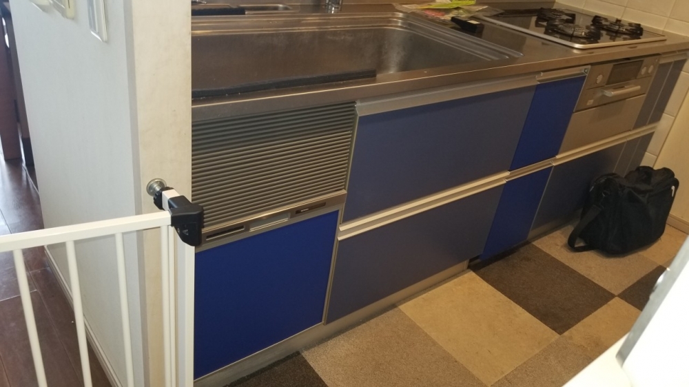 お客様ご使用のキッチンはファーストプラス製で、ここ数年非常に人気のある75cmワイドサイズキャビネットタイプとなります。